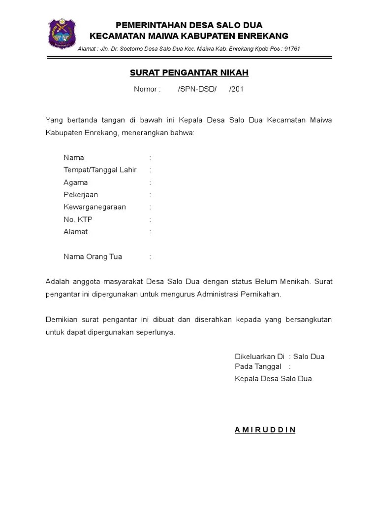 Fc akta kelahiran atau surat keterangan lahir dari desa / kelurahan. Fotocopi akta kelahiran/surat kelahiran/surat kematian. Surat keterangan kepala desa/lurah tentang kelengkapan ahli. Syarat membuat surat pengantar nikah lurah · membawa surat pengantar rt/rw · pernyataan belum pernah/pernah menikah · fotocopy kk · fotocopy ktp. Surat keterangan numpang nikah diperlukan oleh calon .